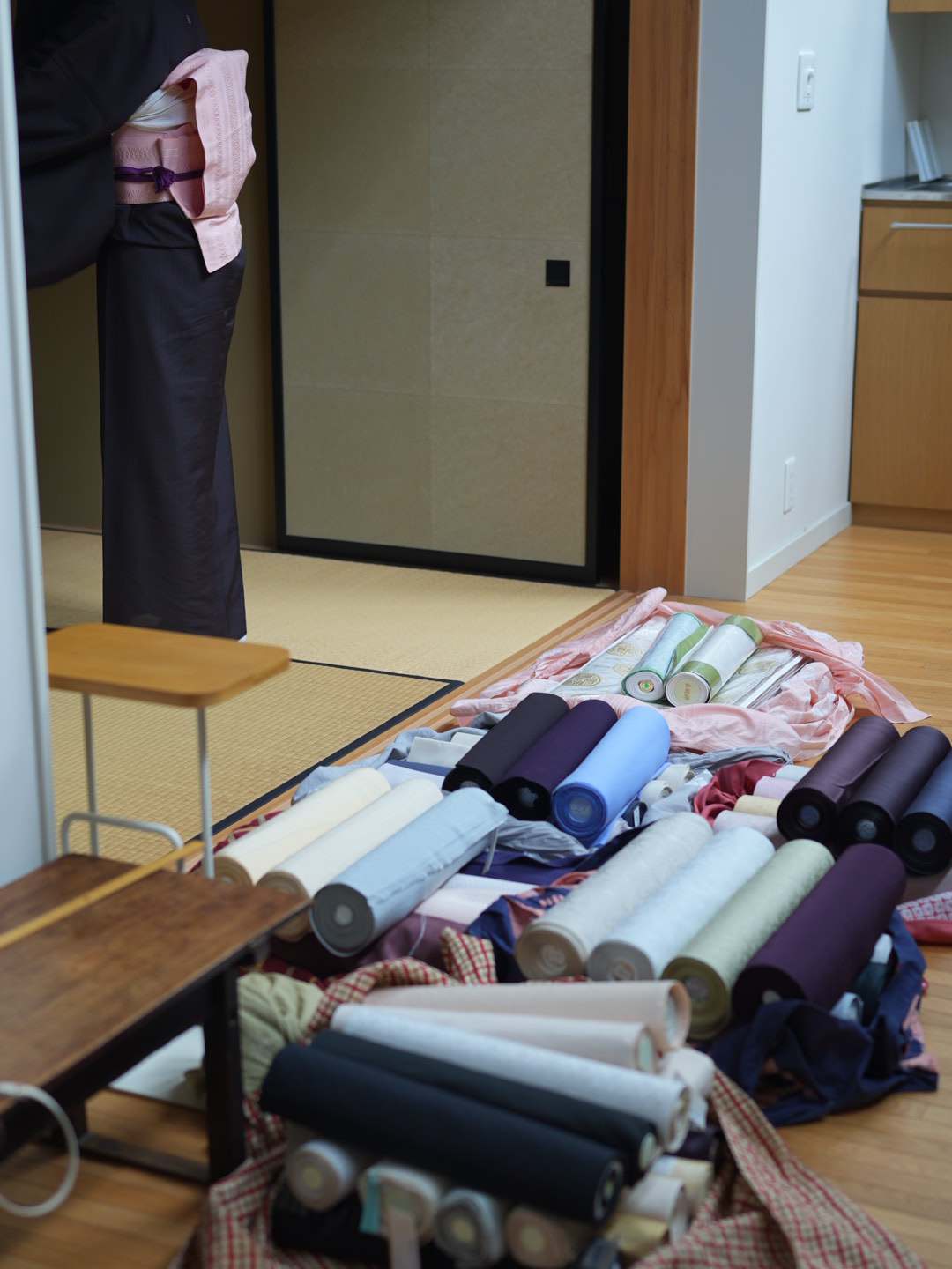 問屋さんからお借りして、初心者向けの反物をたくさんご持参いただきました。